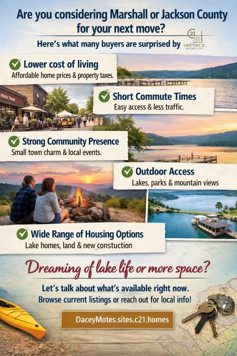 If you’re considering a move to North Alabama, specifically Marshall County or Jackson County, you’re not alone. More and more buyers are discovering the benefits of living in these areas — and many are pleasantly surprised by what they find.